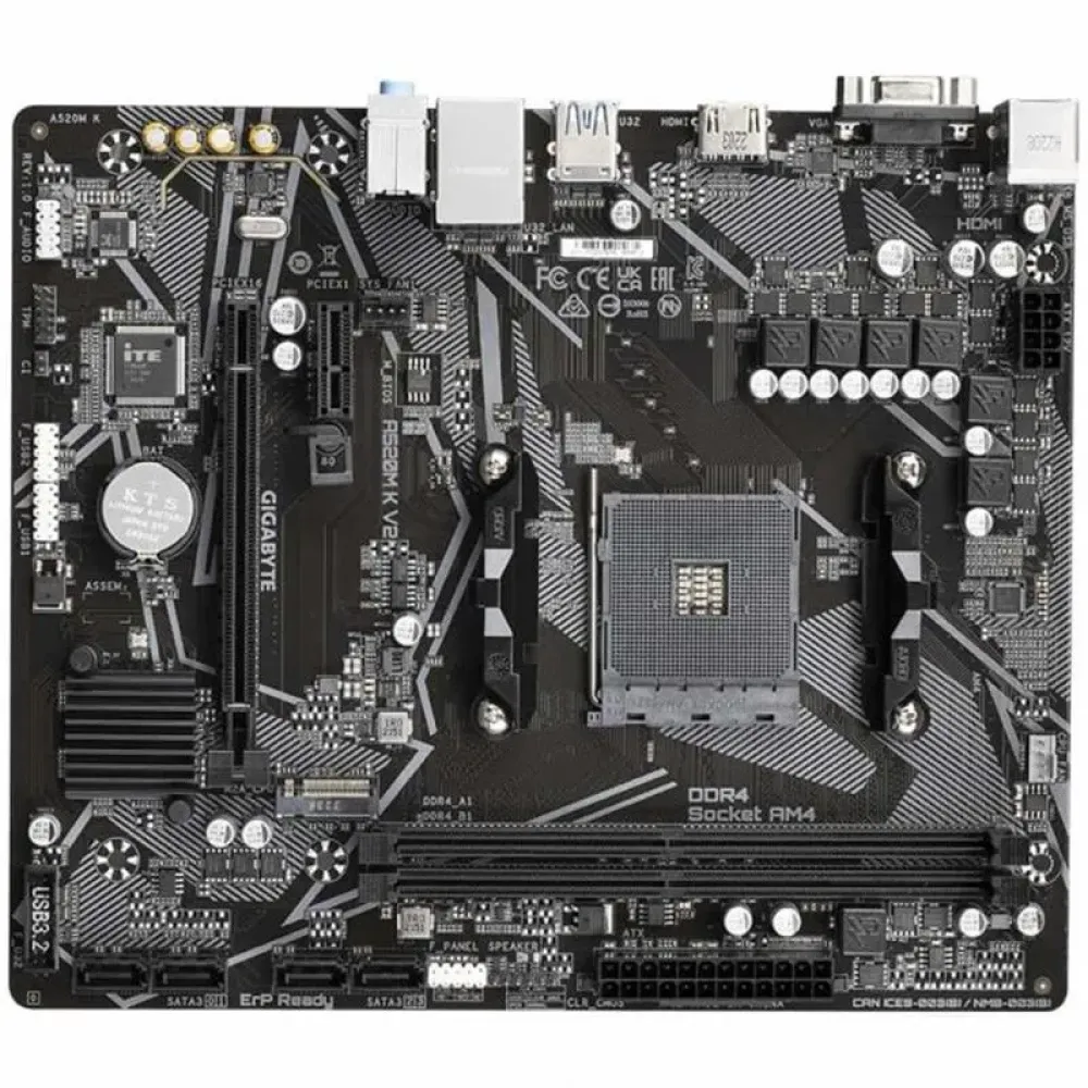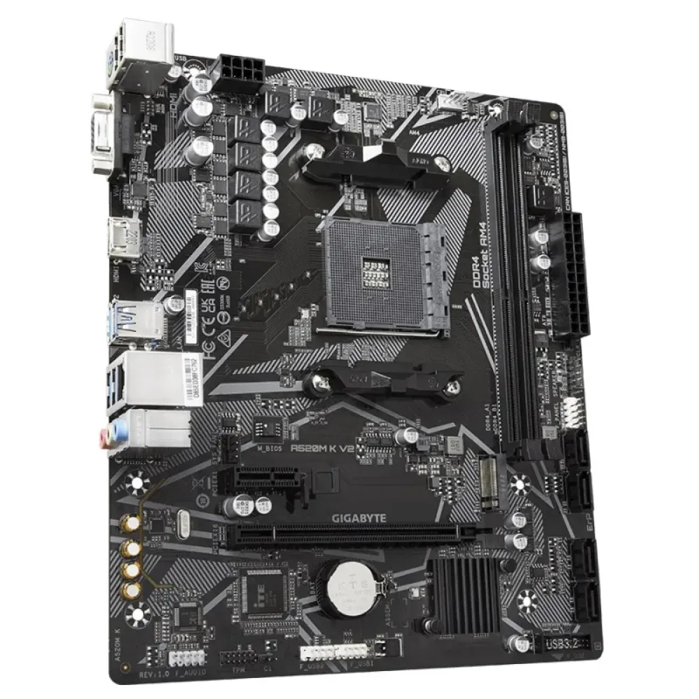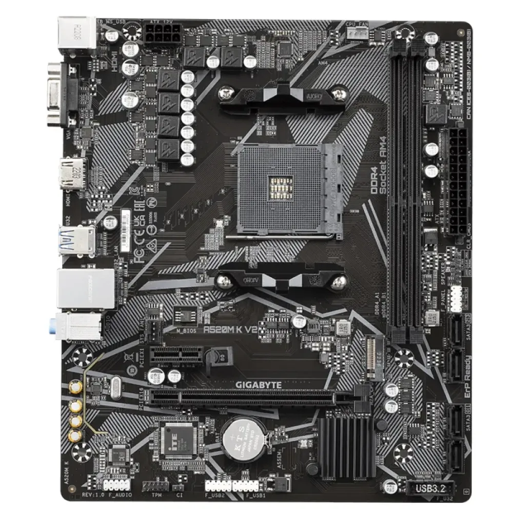 Gigabyte A520M K V2 побудована на чіпсеті AMD A520 і підтримує процесори AMD Ryzen 3-го та 5-го поколінь (з оновленням BIOS для деяких моделей). Вона оснащена двома слотами DDR4 з підтримкою до 64 ГБ оперативної пам'яті, що забезпечує високу швидкість обробки даних та плавну роботу в багатозадачному режимі. Для зберігання даних передбачено один слот M.2 для швидкісних NVMe SSD та чотири SATA 6Gb/s порти.