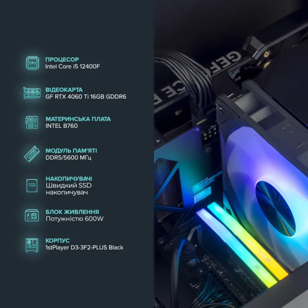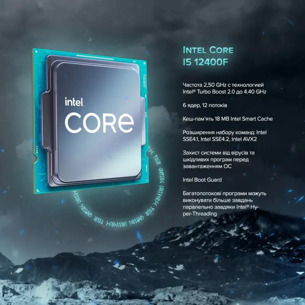 - Процесор: Intel Core i5-12400F з 6 ядрами та частотою до 4.4 ГГц забезпечує високу швидкість обробки даних та плавність геймплею.