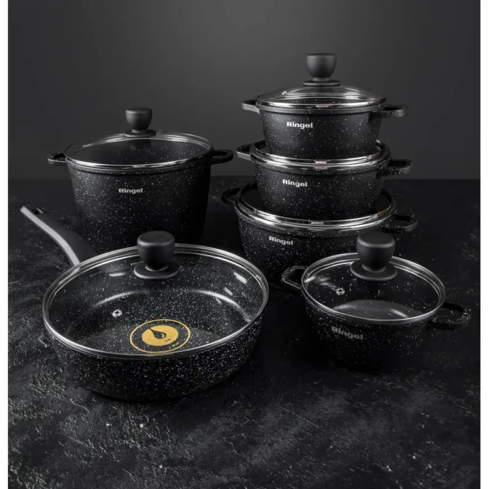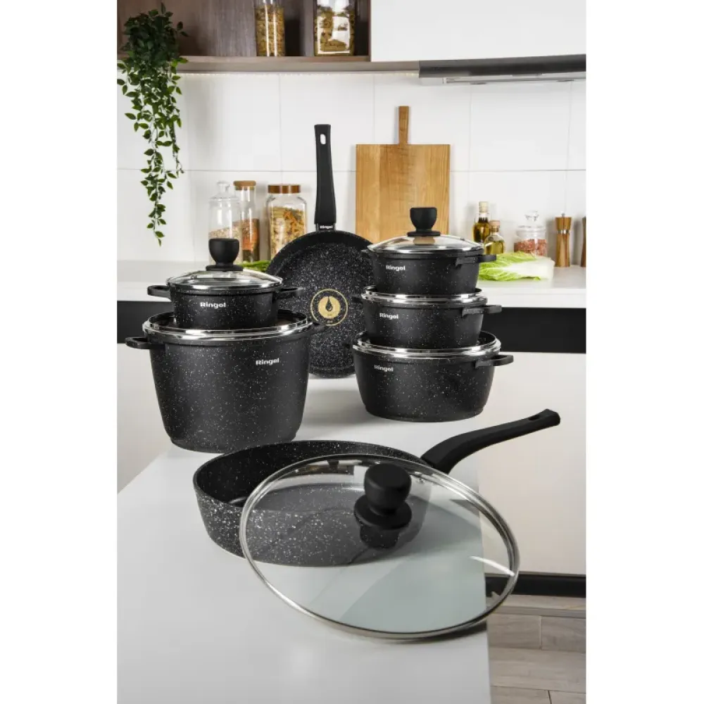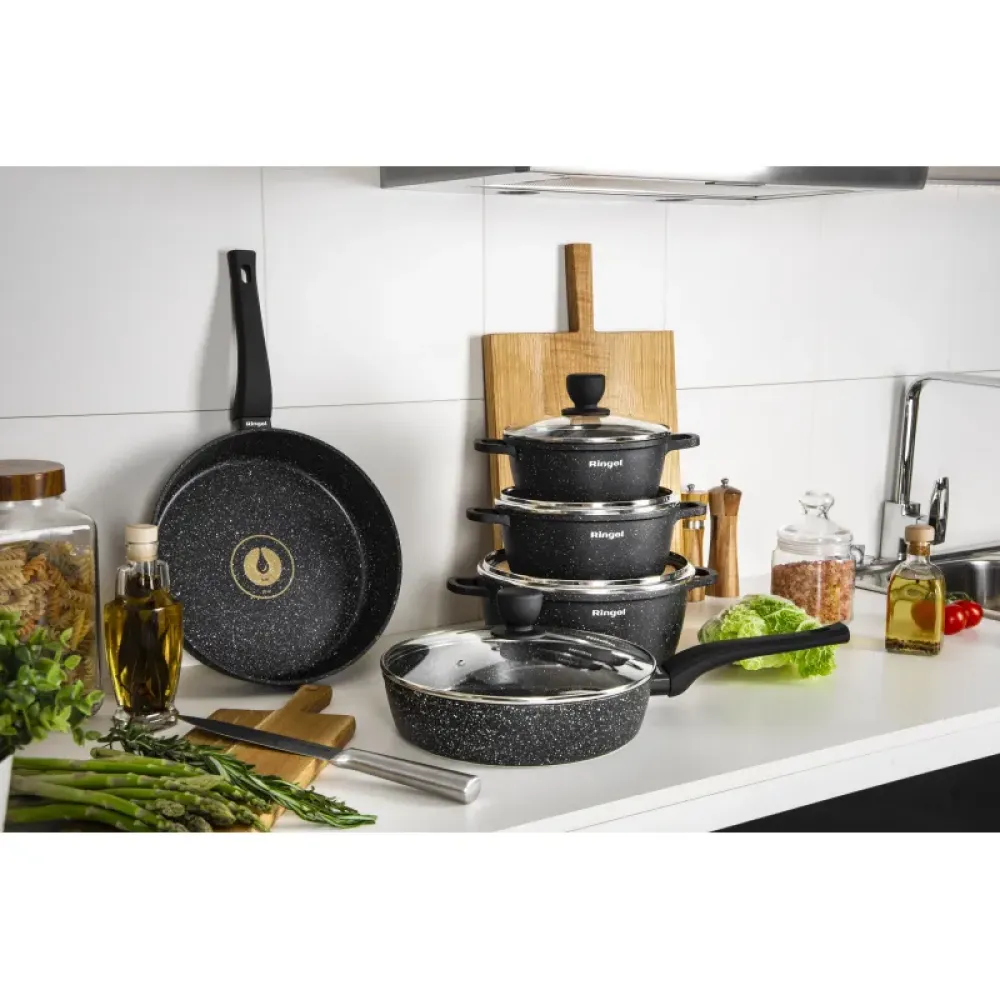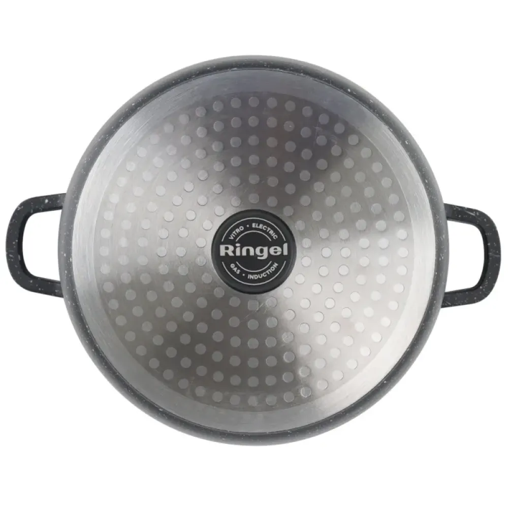 Каструля Ringel Koriander виготовлена з високоякісного литого алюмінію товщиною 4 мм, що забезпечує рівномірний розподіл тепла по всій поверхні. Це гарантує, що ваші страви будуть готуватися ідеально, без пригорання та з однаковою температурою по всьому об'єму. Внутрішнє мармурове антипригарне покриття MARBLE стійке до механічних пошкоджень та зовнішніх впливів, а зовнішнє суперстійке покриття зберігає привабливий вигляд каструлі протягом тривалого часу та полегшує її очищення. Кришка з загартованого скла оснащена отвором для виходу пари та металевим обідком, що забезпечує зручність використання. Індукційний антидеформаційний диск гарантує надійність та довговічність виробу. Важливою перевагою є можливість використання каструлі без кришки в духовій шафі, а також її сумісність з усіма типами плит, включаючи індукційні.